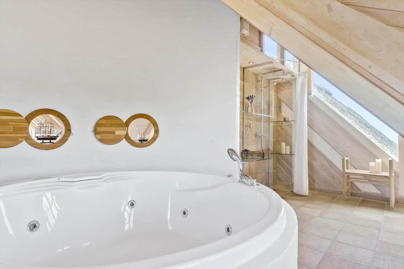 Holiday Home. This luxurious holiday home has a hot tub, a sauna and a fireplace. This spacious holiday home comes with 3 bedrooms, kitchen, a terrace and 2 bathrooms with a shower. Guests will find a refrigerator, a dishwasher, an oven and a microwave in the kitchen. The holiday home also includes a barbecue. Boasting a balcony with sea views, this holiday home also features a washing machine and a TV. The unit has 3 beds.